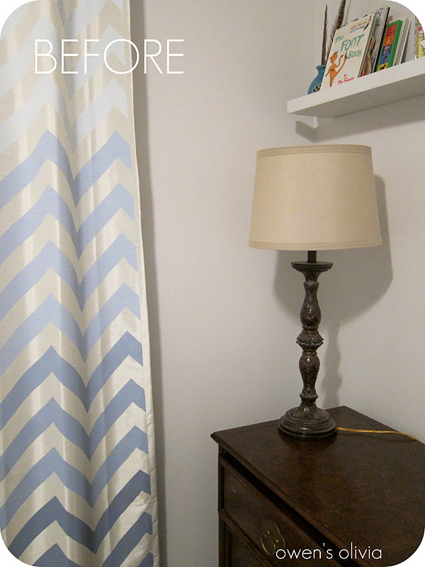 So is this a fail? I'm not certain. Some days I like it, and some days (like today while typing up the post and reviewing photos) I don't like it. I do like the contrast of the blue curtains and the green base. Luckily, the parts are interchangeable, so I could opt for a white base with a detailed shade or a colored base with a simple shade. Or I could put it in a different room. Or I could burn it. But ultimately, that corner of the room is a little happier.